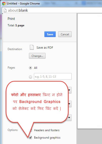 फोटो और हस्ताक्षर फॉर्म में प्रिंट ना होने पर प्रिन्ट से पहले Background graphics सलेक्ट करें |